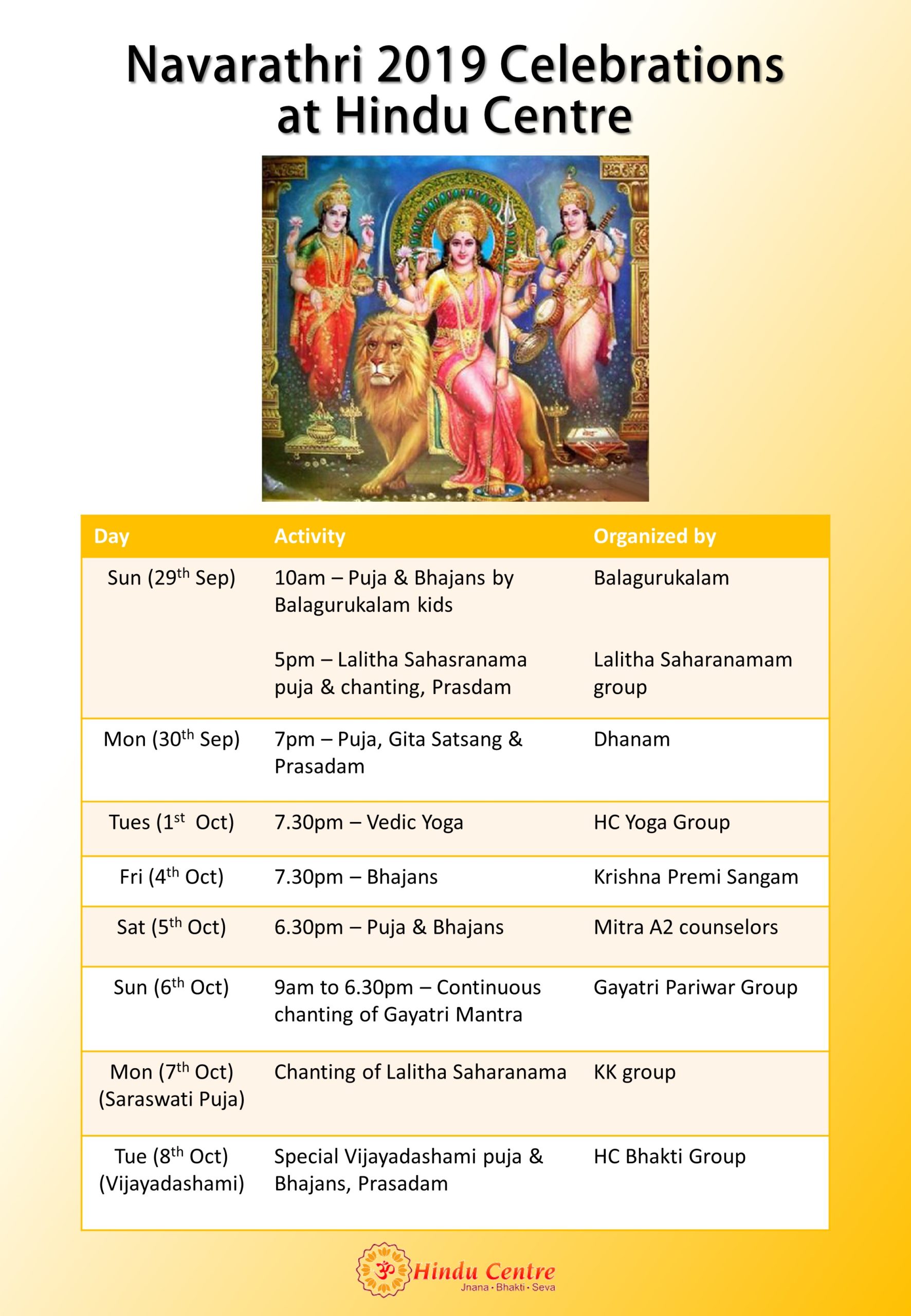 Navaratri Celebrations 2019 @ HC + Add to Google Calendar + iCal / Outlook export The event is finished. Categories No categories